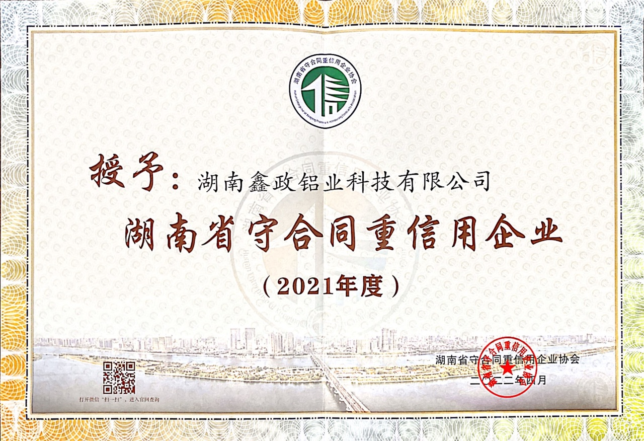 瀏覽次數(shù):206近日,2021年度湖南省“守合同重信用企業(yè)”名單公布,湖南鑫政鋁業(yè)科技有限公司榮膺湖南省“守合同重信用企業(yè)”稱號。